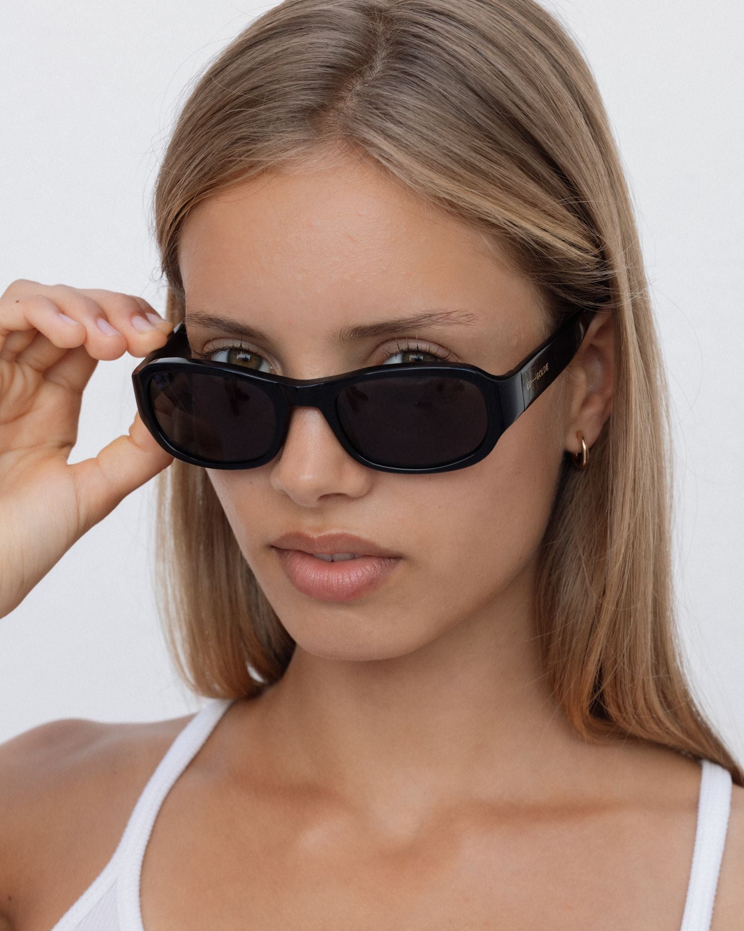 Inlayed LU—GOLDIE logo on both temples