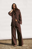 Straight leg cotton pants in Arcaa’s espresso stripe, designed with a soft elasticated waistband and internal drawcord. Relaxed fit through the hip and leg offers comfort for everyday movement, lounging or travel.