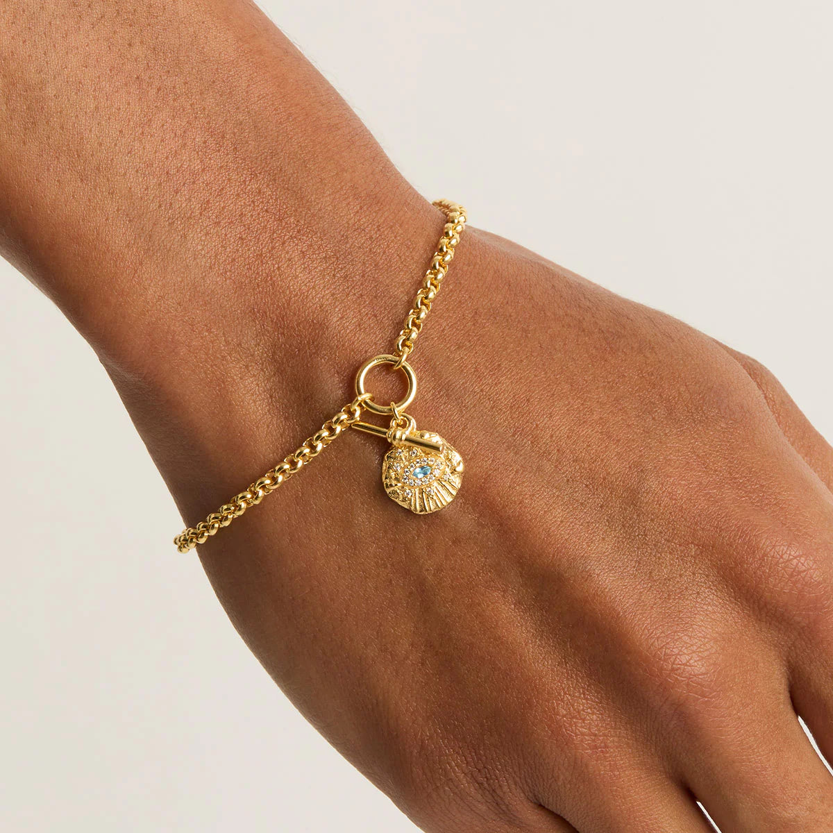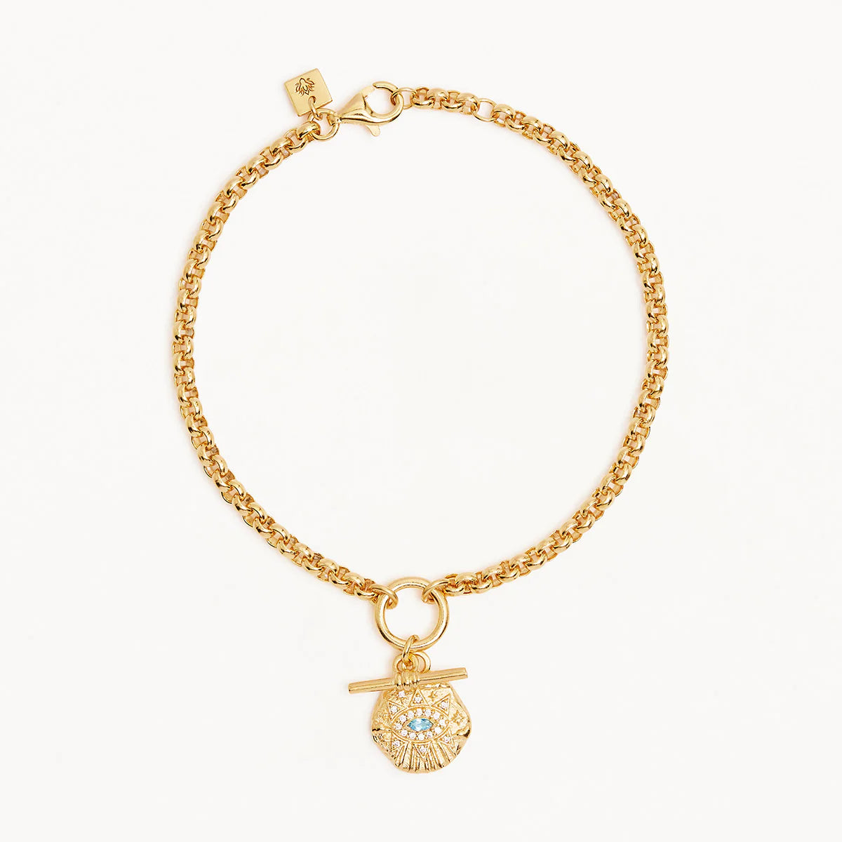 Illuminate the path to your dreams with our Awaken Fob Bracelet. Crafted with a statement belcher chain and fob style, this bracelet features a natural blue topaz framed by an Eye of Intuition. Wear this piece and shine a light on your inner guidance.
