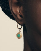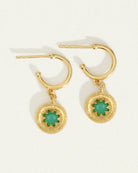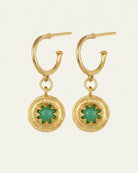 The Cora Earrings, in 18k gold vermeil, are a small hoop earring featuring verdant orbs of Australian chrysoprase set into golden medallions with a radiant star design, inspired by ancient Turkish, Bedouin and Berber jewellery.