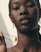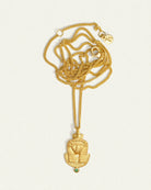 The Dendera Necklace is an 18k gold vermeil, Egyptian necklace inspired by the Hathor capitals at the Temple of Dendera.