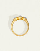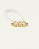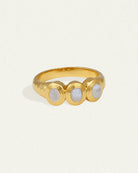 Crafted from 18k gold vermeil, the Talis Trilogy Ring features three bezel-set cabochons. Blue lace agate, known for its soft blue and white banding, is historically linked with tranquility and emotional balance.