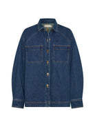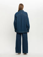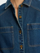 The Evie Denim Shirt is a dark indigo wash in an oversized drop shoulder fit, featuring a button down front with patch pockets, full length sleeves complete with signature logo hardware.