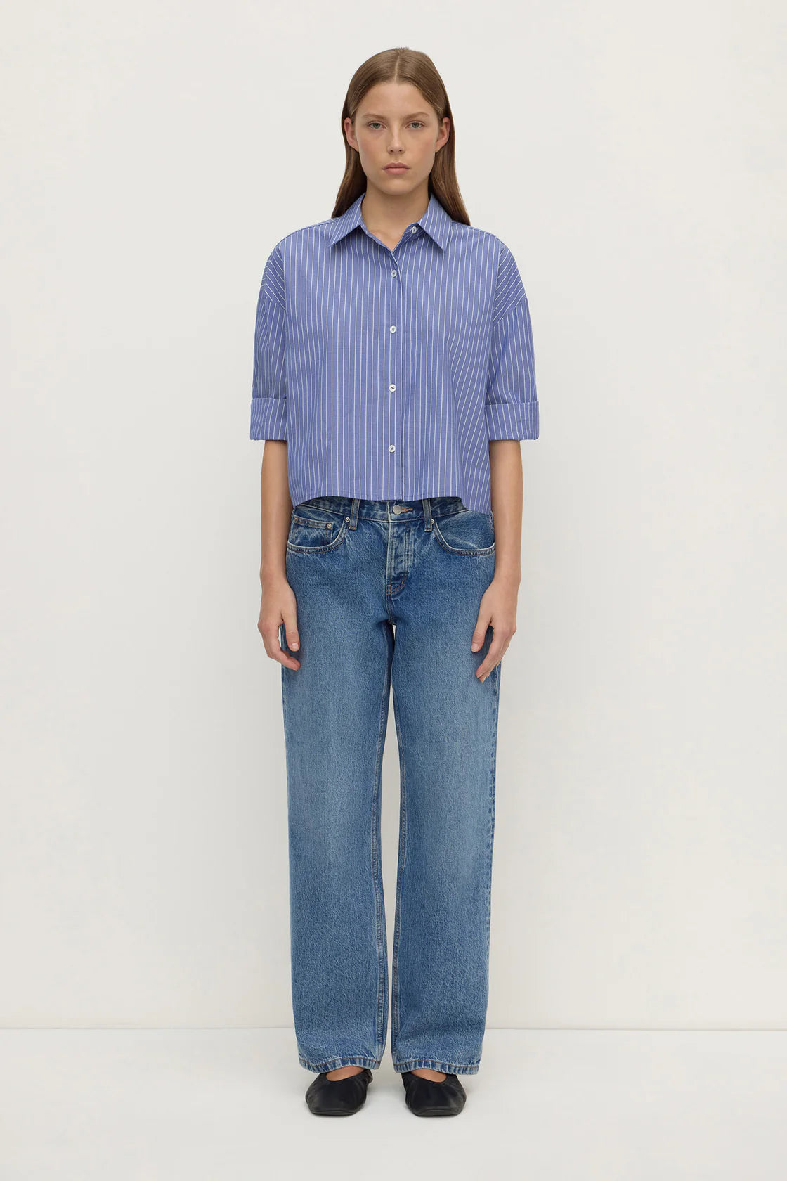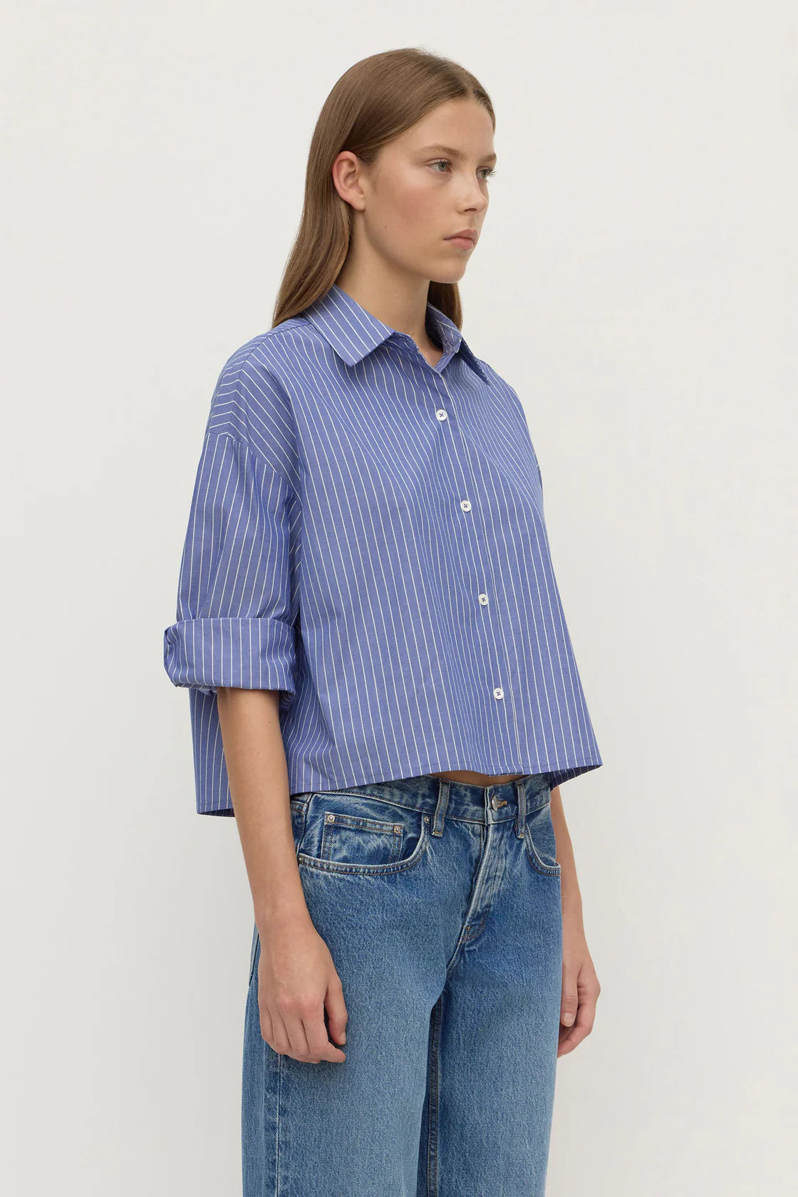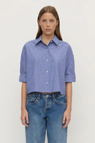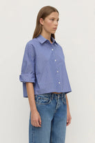The Anais Stripe Cropped Shirt in blue/white stripe is a 100% cotton button down shirt with a boxy, cropped fit and 3/4 sleeves.