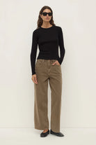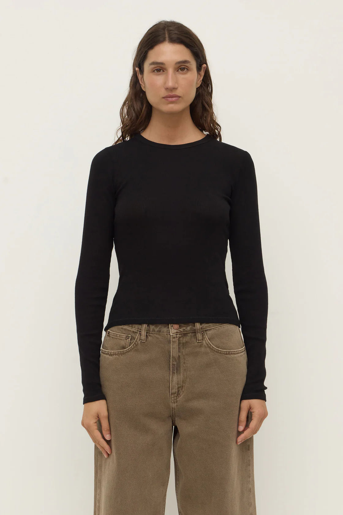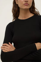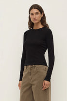 The Zali Long Sleeve Tee in black is a 100% cotton ribbed fitted long sleeve with a ribbed neckline.