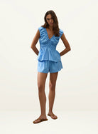 An elevated everyday top, designed from a signature 100% BCI Certified organic cotton in a Azul Micro Pinstripe. Featuring an elasticated V-neckline with a front tie detail, it cinches in at the waist with a channelled elastic waistband. From there it flares into a peplum hem that crops around the hips. Versatile in styling, wear with the matching shorts.
