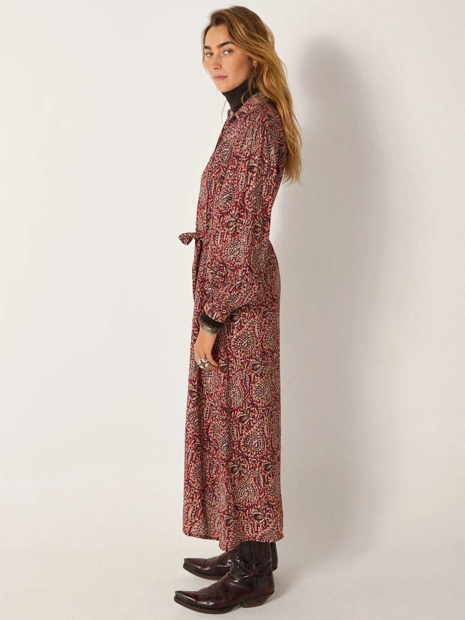 The silhouette is long and fluid, buttoned through the front with a self-belt to define the waist. Full sleeves gather into cuffs, adding balance to the ease of the body. The skirt drops in generous panels, widening towards the hem with natural movement.