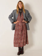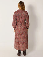 Cut in lightweight viscose, the Aretha Dress carries the Johnny print — intricate paisleys and florals arranged in repeating medallions, mixing red, blue and sand into a surface rich with detail.