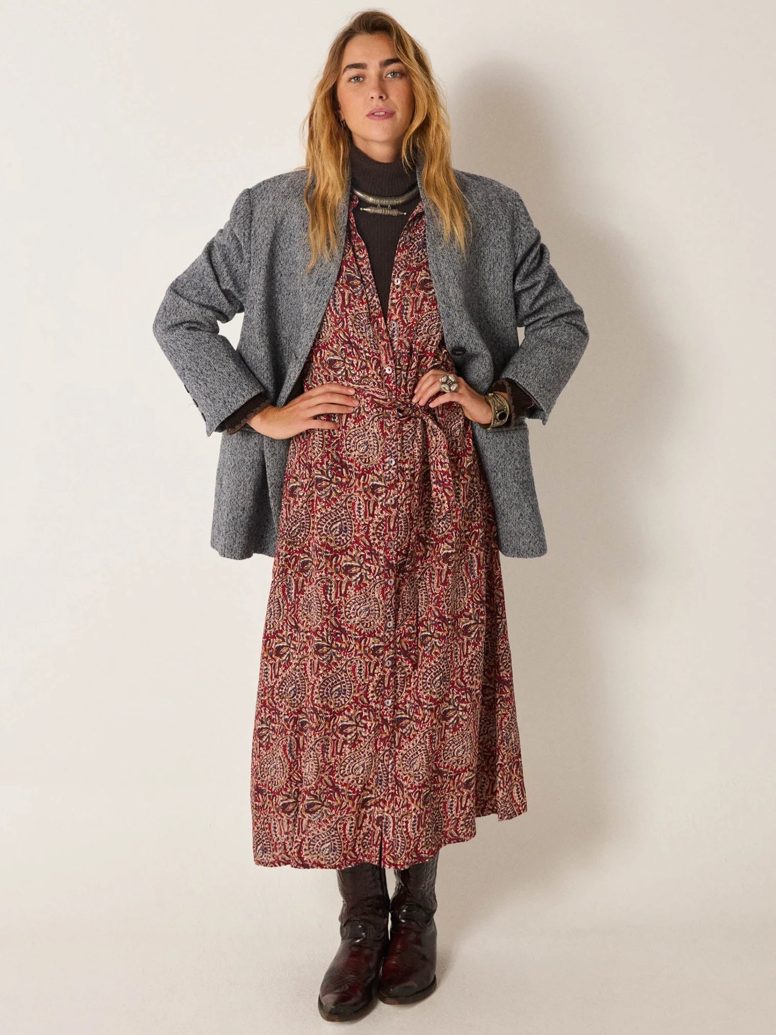 Styled here layered over a Dolcevita knit with boots. Anna blazer added for chillier days.