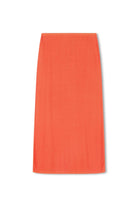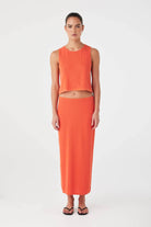 The Theo Skirt in Mandarin is a longline knit with soft ribbing and a flexible concealed elastic waist. Designed to be worn high or low on the waist, it creates a fluid silhouette with lightweight movement. Knitted from an organic cotton and hemp blend, it offers breathability and comfort through warm-weather dressing.