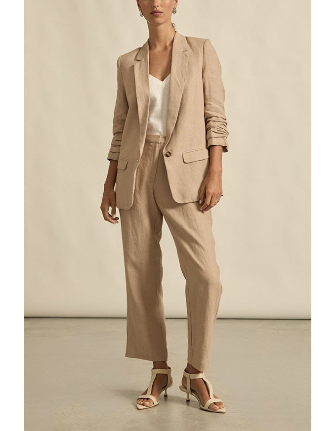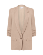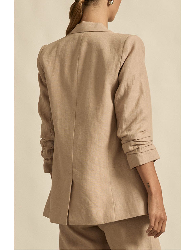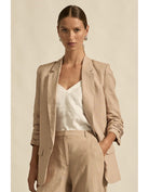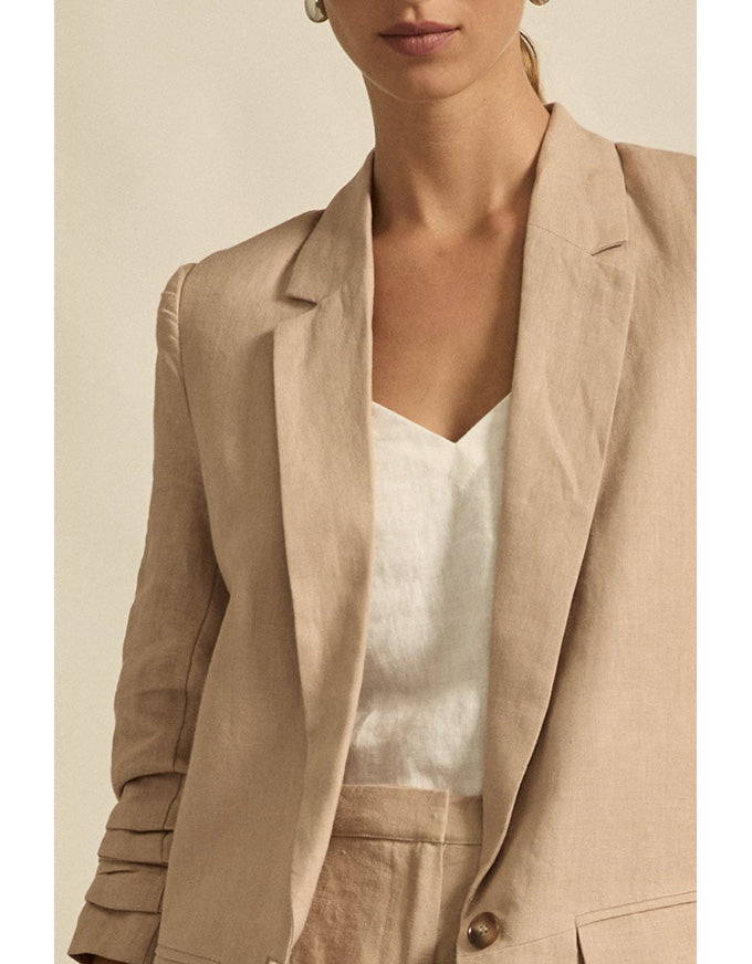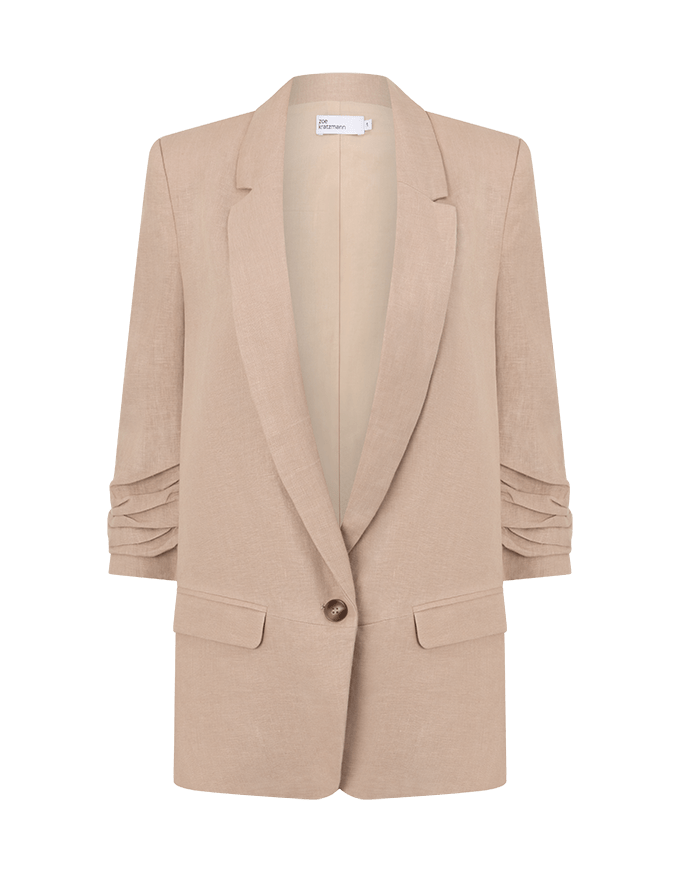 a lightly structured jacket is the perfect solution for effortless yet elevated spring dressing. this piece adds polish and edge to both dresses and pants. a ¾ ruched sleeve has a relaxed, slightly undone feel. the prevail is an update on our best -selling jacket the entitle with the added benefit of a center button to secure the front labels. a go-to style for spring or summer and the perfect travel companion.