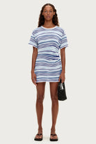 A relaxed-fit T-shirt mini dress crafted from a soft ramie-cotton blend in a bright blue and white stripe. Featuring a classic crew neckline, drop shoulders, and a side waist cut-out detail with an adjustable drawcord for a flattering, customisable fit.